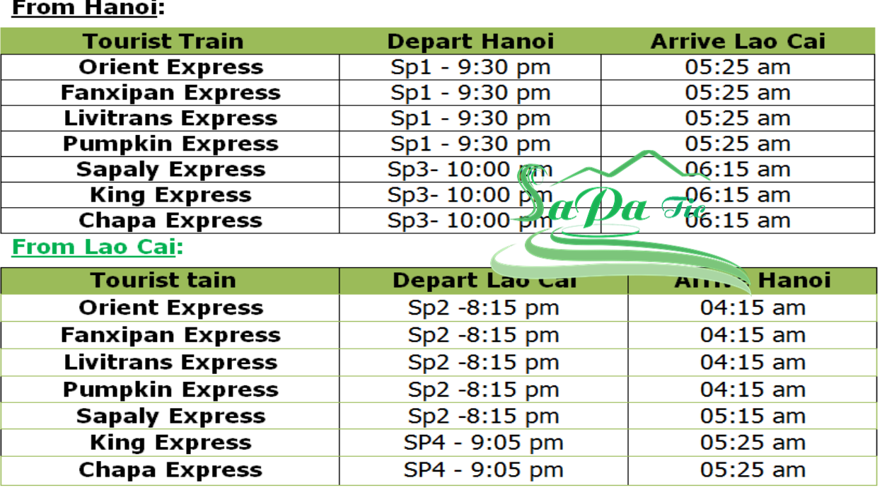 Departure at night. The night trains often departs at between 8pm and 10pm, and you can catch a good sleep before getting woke up by the beautiful mountain scenery at dawn. Ticket for night train is $35-180/person/way .Tourist train including : Victoria Express, Sapaly Express, Fanxipan Express, Livitrans, Hara, Orient Express... Names of train from Hanoi to Lao Cai is, SP1 (21:30pm), SP3 (22:00pm),at the weekend maybe have sp7 . you Can contact me to get cheap price ( including bus pick up )